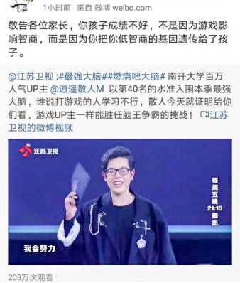 主持人蔣昌建說:“我們一般的印象,當(dāng)然是刻板印象,覺得玩游戲的人好像成績(jī)都不一定特別的好。”