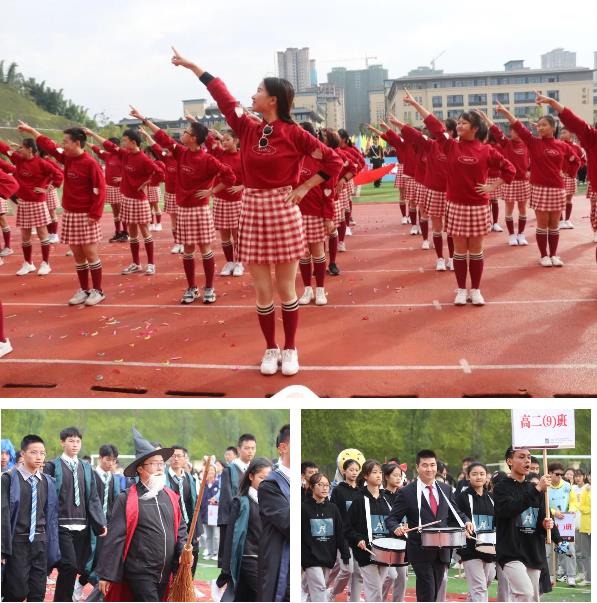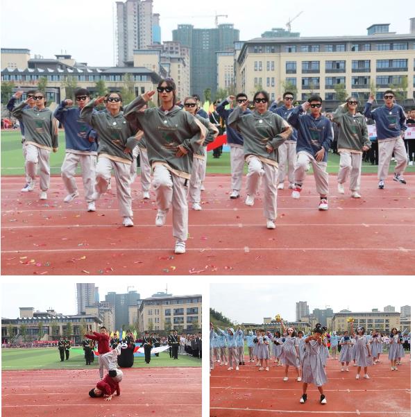 潔白的和平鴿應(yīng)聲而起飛向藍(lán)天,鼓樂隊奏響激昂的運(yùn)動員進(jìn)行曲,班旗方陣與彩旗方陣的百余名同學(xué)擎著代表班級榮譽(yù)的旗幟,帶起陣陣破風(fēng)之聲,這聲音不僅預(yù)示著運(yùn)動會的勝利開幕,更彰示著自貢衡川定將勢如破竹,走向更高的天空。初一、高一 花球啦啦操