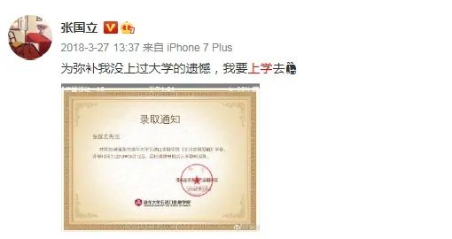 前年,64歲的演員張國立憑借自己的努力,自學(xué)考生,成功考上清華大學(xué)五道口金融學(xué)院,在收到錄取通知書后,第一時(shí)間在微博上分享了自己的喜悅,并配文“為彌補(bǔ)我沒上過大學(xué)的遺憾,我要上學(xué)去”。