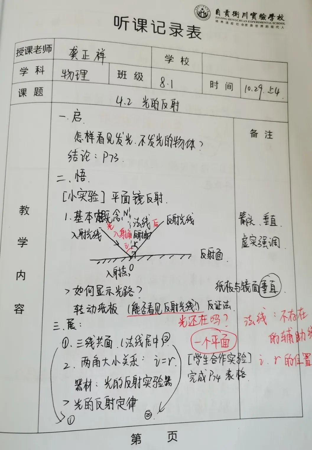 首先,聽課時不要只記錄課堂流程,更要隨時把自己所關(guān)注和思考的東西標(biāo)注出來,比如對某些概念的深入闡釋,對難點的具體處理方式,對學(xué)生特定反應(yīng)的應(yīng)對等。