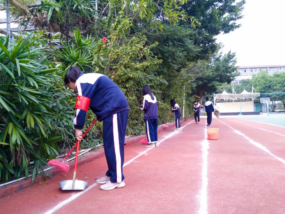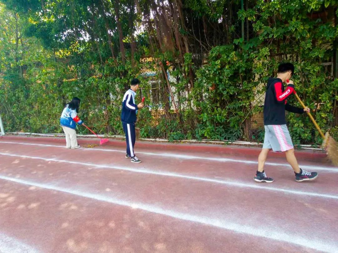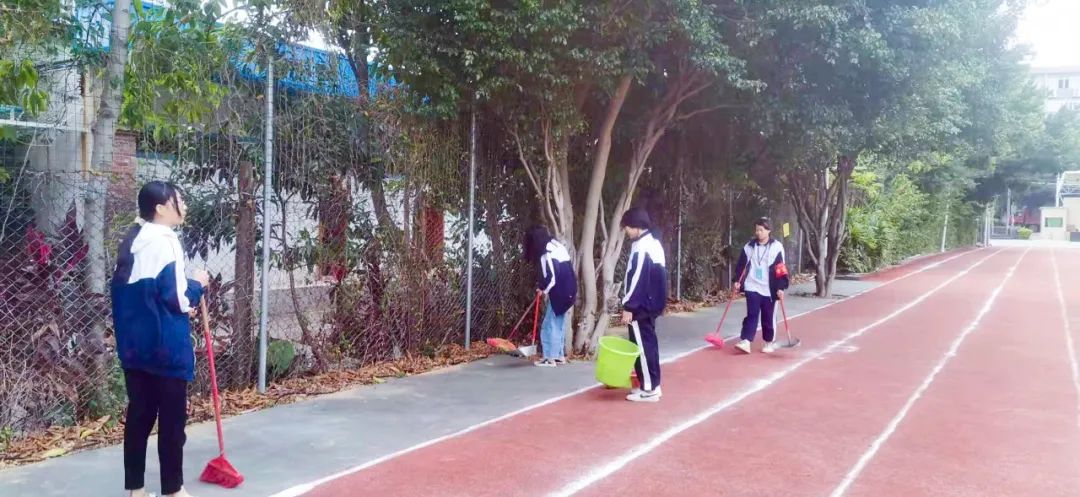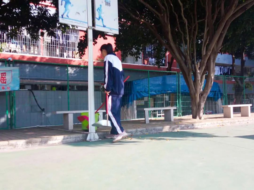 提前到達(dá)操場的是王廷榮、黃詩文、李仁懷、李燦彬、溫善媛等同學(xué)。他們揮動著掃把便開始“沙沙”地清掃落葉,掃地的聲音好像鳥兒在對他們唱歌,又像是在鼓勵(lì)他們:“勞動的孩子最美麗”。