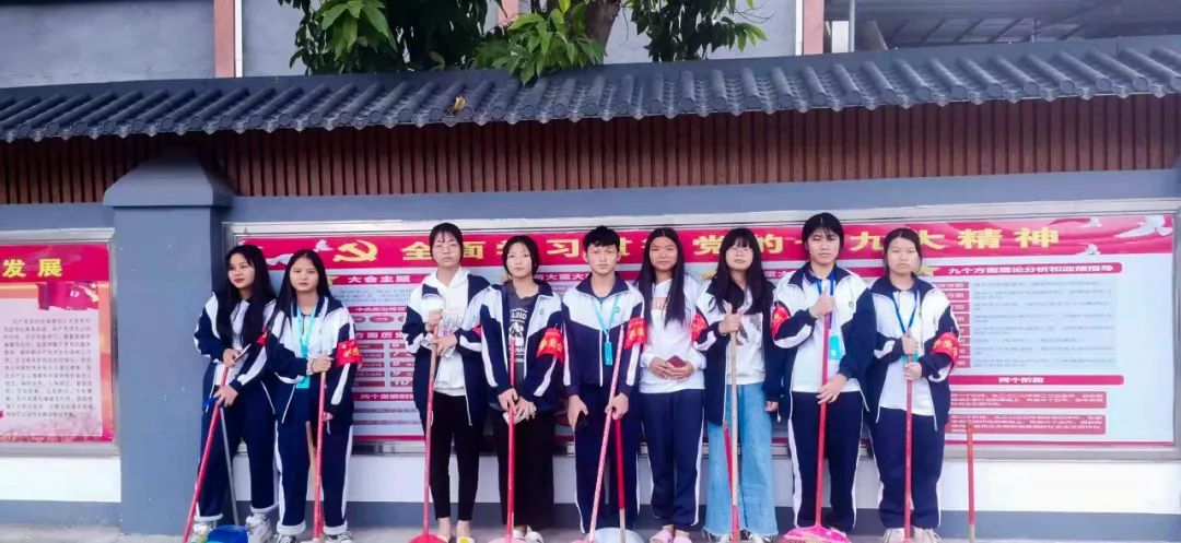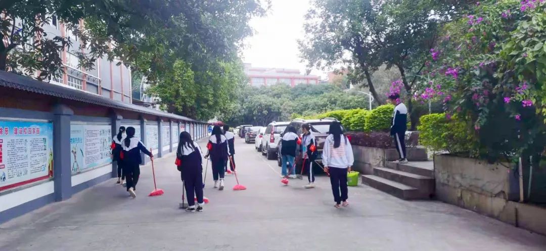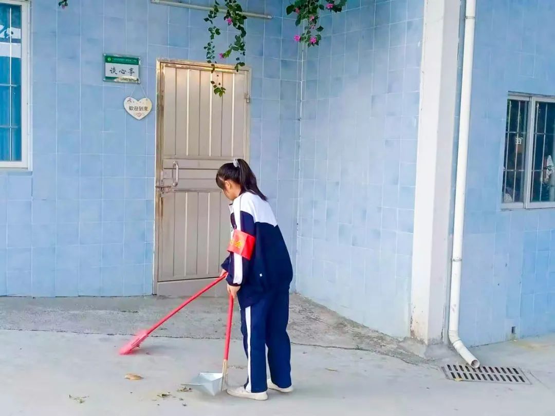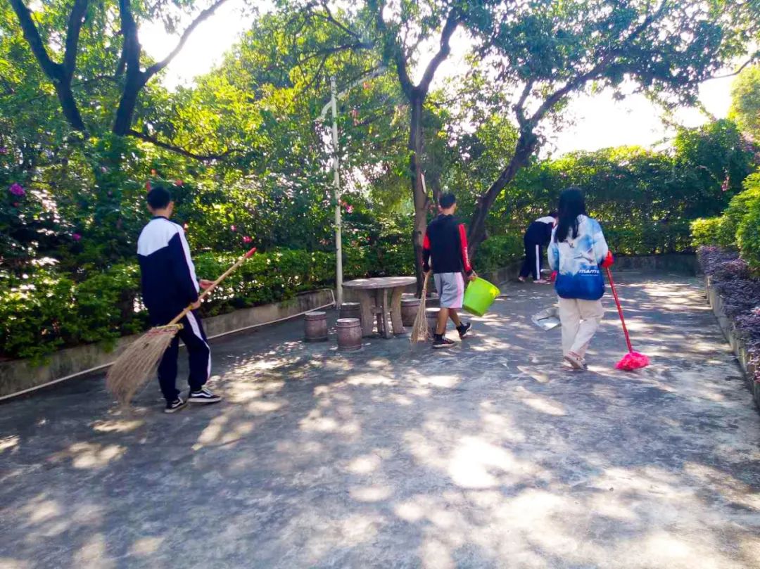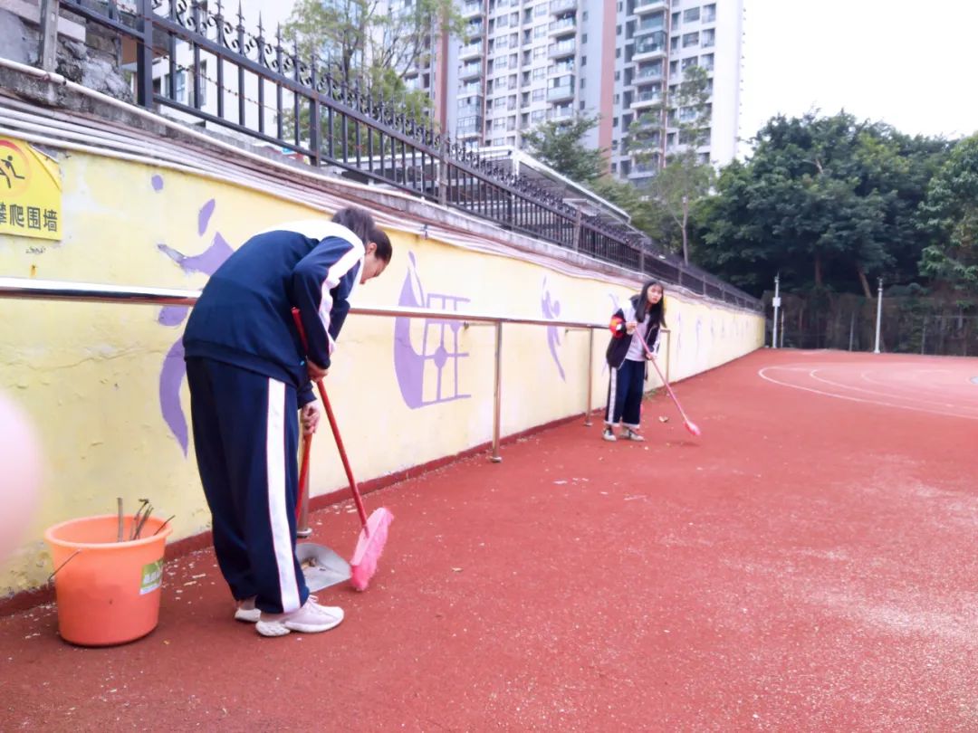 提前到達(dá)操場的是王廷榮、黃詩文、李仁懷、李燦彬、溫善媛等同學(xué)。他們揮動著掃把便開始“沙沙”地清掃落葉,掃地的聲音好像鳥兒在對他們唱歌,又像是在鼓勵(lì)他們:“勞動的孩子最美麗”。