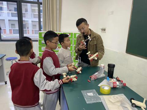 有一些語數(shù)課上的“笨孩子”,在科學(xué)大課堂上非?;钴S,在完成任務(wù)的基礎(chǔ)上還樂于幫助其他同學(xué),課后也會常常找柴老師詢問關(guān)于制作方面的問題。除了講授每個(gè)小制作的原理,教學(xué)生組裝最基礎(chǔ)的零件,柴老師還別出心裁,將原來滑翔機(jī)上的零件拆下來改造成了水上自由漂浮的小船。這讓學(xué)生對這些小制作更感興趣,原來只要簡單地轉(zhuǎn)化一下思維,稍加改動(dòng),就可以變成新的小玩意兒。